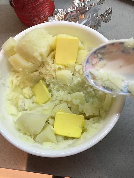 邊壓邊丟三片奶油,海鹽跟一點點牛奶,因為馬鈴薯剛拿出來還有顆火熱的心,奶油自己會融掉。